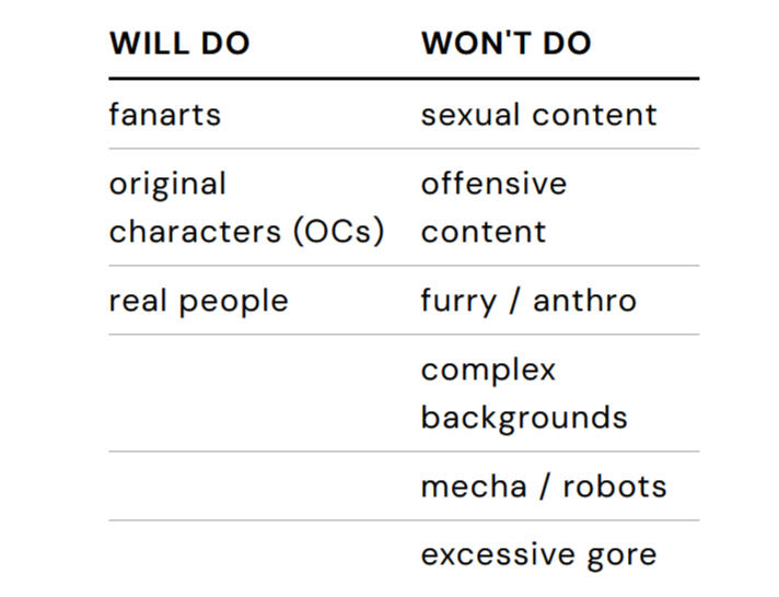• Regarding other topics or in case of any questions, please contact the artist.• The cost of extra characters is 50% of the base price.• In the case of small variations of the same design, such as colors, details, or simple backgrounds, an additional 25% of the base price will be charged per variation.
